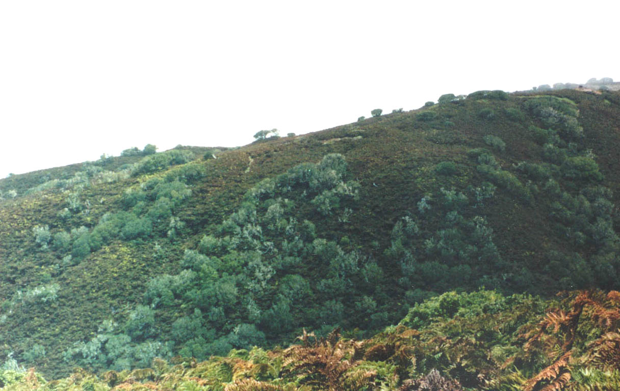 Drimys confertifolia (Winteraceae): forma bosques en la isla Robinson Crusoe (en verde claro) Foto: A. Tomé.