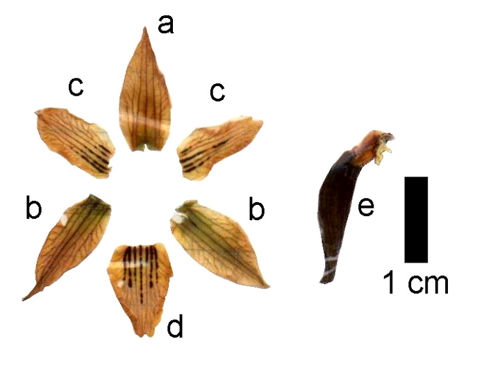 Presencia de Gavilea kingii (Orchidaceae) en Magallanes: Estructura de la flor, a) Sépalo dorsal, b) Sépalos laterales, c) Pétalos, d) Labelo y e) Columna.