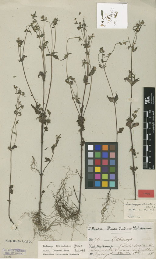 Macaya & Teillier: Dalea cylindrica Hook. (Fabaceae) y Galinsoga mandonii Sch- Bip. (Asteraceae) en Chile. Ejemplar tipo de Galinsoga mandonii Sch. Bip. en el Swedish Museum of Natural History (G. Mandon 76-Bolivia)