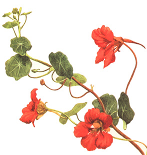 Tropaeolaceae: Tropaeolum majus, espuela de galán; hierba perenne,