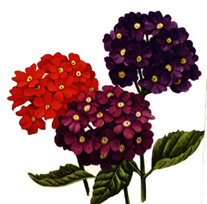 Verbenaceae: Híbridos de Verbena, hierbas perennes, ornamentales.