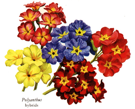 Primulaceae: Primula x polyantha, híbrido con una gran cantidad de cultivares ornamentales.