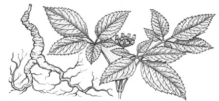 Araliaceae: Panax ginseng, arbusto asiático, cultivado por sus raíces medicinales (Izq).