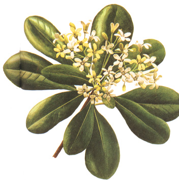 Pittosporaceae: Pittosporus tobira, arbolito ornamental, cultivado en Chile. Origen: Australia.