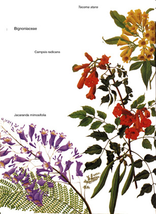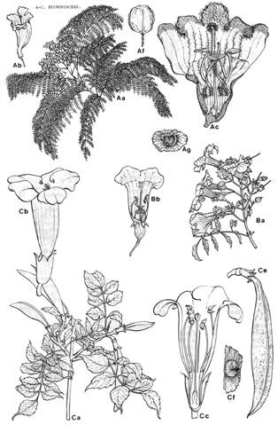 Ca. Campsis radicans. Cb. flor. Cc. flor en sección. Cc. Ce.