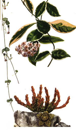 Especies ornamentales. Izq. Ceropegia woodii. Arriba: Hoya carnosa.