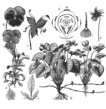 D.Viola odorata ("violeta"), E. diagrama floral de Viola