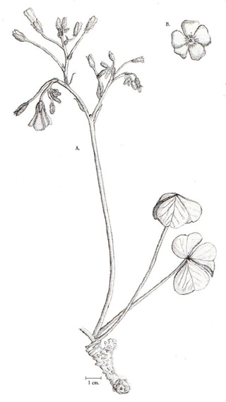 Oxalis atacamensis: A. Hábito. B. Flor (K. Finger, original)