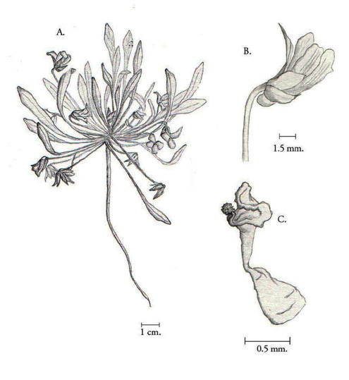 Viola taltalensis var. taltalensis: A. Hábito. B. Flor.C. Pistilo (K. Finger, original).