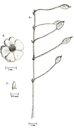 Calandrinia taltalensis: A. Inflorescencia. B. Flor. C. Brácteas (Original: K. Finger)