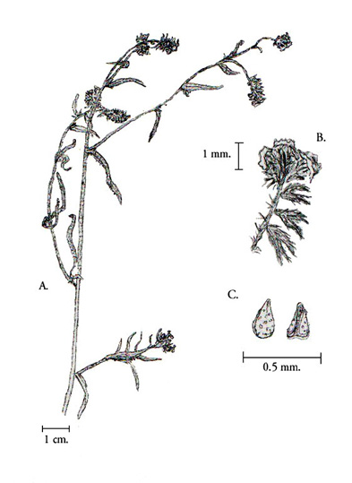 Cryptantha subamplexicaulis: A. Hábito. B. Inflorescencia. C. Núculas (M. Ricardi, 2687).Original: K.Finger.