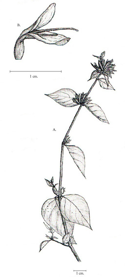 DESCRIPCIÓN MORFOLÓGICA: Hierba perenne, con varios tallos cilíndricos de 0,3 – 0,6 m, finamente puberulos, ramosos. Hojas enteras, opuestas, aovado- oblongas, angostadas hacia ambos extremos, cortísimamente pecioladas, agudas, mucronadas, sembradas de uno que otro pelito; de 1- 4 cm. Flores en panículas dispuestas en el extremo de los tallos; cada una protegida por tres pares de brácteas lineares, agudas, mucronadas. Cáliz delgado, muy corto, de 2 mm, con 5 divisiones profundas. Corola rosada; tubo de 5 mm; los dos labios de la misma extensión, transovados, el anterior muy cortamente tridentado. Estambres 2, de 5 mm., insertos en el tubo de la corola y casi del largo de los labios. Estigma cortamente bilobulado. Ovario con 2 carpelos, 2 primordios seminales en cada uno. Fruto, una cápsula ovoide, algo comprimida, sésil. Semillas 1- 4, comprimidas, orbiculares, ásperas, negras, blanco- granuladas. Fotos.