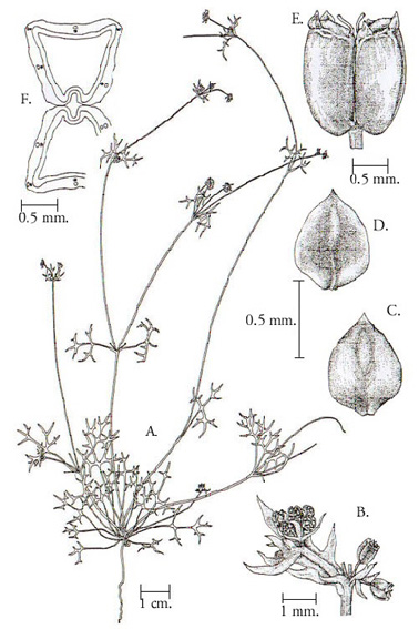 DESCRIPCIÓN MORFOLÓGICA: Hierba anual, muy delgada, tallos postrados, delgados, poco y dispersos, de 10-30 cm de largo. Las hojas forman una semi-roseta en la base y son opuestas hacia el extremo de la planta, u, ocasionalmente alternas; pecíolo delgado, 1-4 cm, débilmente dilatado y escasamente escarioso-marginado en la base; hojas caulinares reducidas hacia el ápice. Pedúnculos 1 ó 2 que salen de las axilas de las hojas superiores, delgados, de más de 2 cm, umbelas de 3-5 mm de diámetro, generalmente con 3-6 flores, las brácteas lineares a oblanceoladas, generalmente agudas, de 1-2 mm. Flores purpúreas; lóbulos del cáliz aovados de ca. 0,2 mm de largo; pétalos anchamente aovados, de 0,6-0,8 mm., aguzados, ápice recto, generalmente purpúreos en el extremo y blanco verdosos en la mitad inferior; filamentos de los estambres de más de 0,5 mm., las anteras orbiculares, ca. 0,3 mm; estilos muy cortos, 0,5 mm, divergentes; estilopodio deprimido pero más largo que el estilo; pedicelos robustos, de más 1 mm. Fruto + orbicular, ca. 1,5 x 1,5 mm, claramente angulado, carpelos con dorso plano. Fotos.