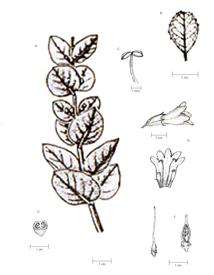 DESCRIPCIÓN MORFOLÓGICA: Arbusto de hasta 3 m. Ramas adultas agrietadas, glabras, las jóvenes muy pubescentes con pelos cortos más menos patentes. Hojas de 26- 40 x 17- 33 mm, opuesto-decusadas, coriáceas, elípticas, anchamente ovadas a suborbiculares, a menudo apiculadas, mucronadas, glabras en ambas caras o ralamente pilosas en el envés, sobre un nervio medio prominente; pedúnculo de 3- 4 mm, muy pubescente. Flores blanco- violáceas; brácteas de 2,5- 3 mm, subuladas, pilosas; pedúnculos de 3- 4 mm., pubescentes. Cáliz de 6-7 mm., sépalos glabros o con algunos pelos ralos en la base; segmentos de 1,5- 2 mm, deltoides a triangulares; corola de 10- 15 mm., tubo de 7- 11 mm, densamente cubierto en la parte externa de pelos retrorsos seríceos, con excepción de la porción incluida en el cáliz, que es glabra; pétalos de 3,3 – 4,5 mm., redondeados, algo desiguales, con la cara externa con pelos retrorsos y el margen barbado y la interna con pelos capitados entremezclados con pelos rizados no capitados. Filamentos de los estambres laterales de 5- 8 mm, los ventrales de 7,2- 10,5 mm, a veces con algunos pelos; anteras de 1- 1,2 mm., estaminodio muy desarrollado, cónico. Ovario de 1,8- 2 x 1,3- 1.5 mm., 9-12 ovulado, elipsoide, glabro; disco hipógino irregularmente lobado, cupuliforme; estilo de 6- 6,5 mm; Cáliz fructífero acrescente, hasta 8,5- 9 mm. Fruto, una cápsula de 9 x 3,5 mm, elipsoide, subdehiscente o indehiscente. Semilla de 6,5 x 3 mm, ovoide.